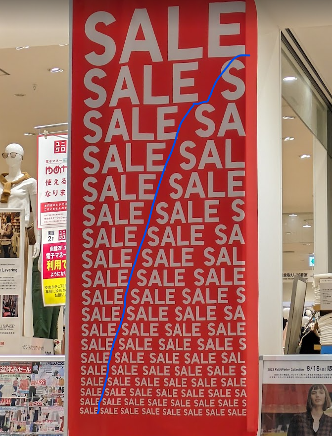 ユニクロで見かけた「SALE」が並んだ垂れ幕。