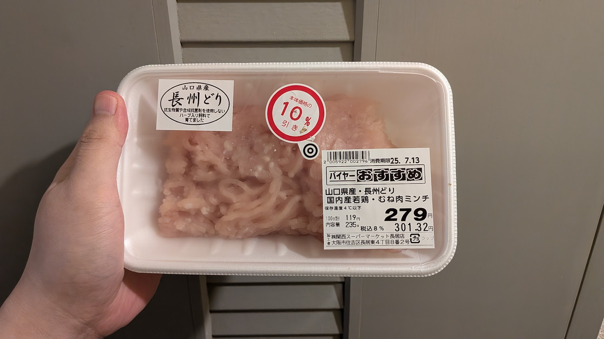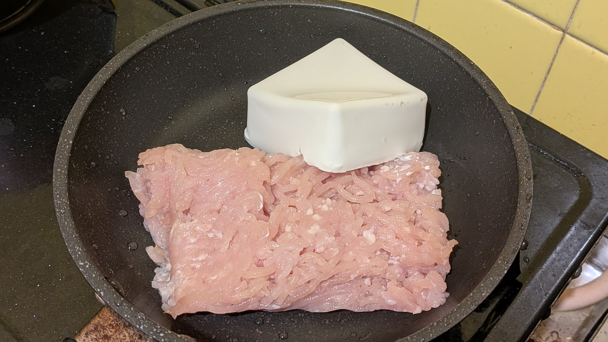 ちなみに、この後フライパンのなかで混ぜ合わせて、その上にピーマンを大きく切ってのせて、ピーマンの肉詰めもどきみたいな感じにしています。焼肉のたれで味付けして、ちょっとつくね感。